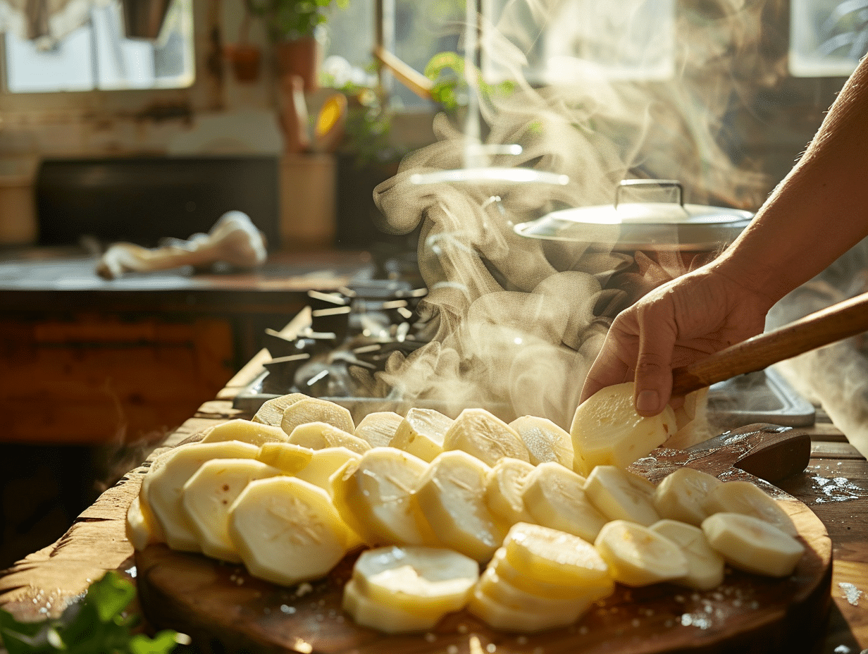 Une fois le manioc sécurisé, la préparation s’entame. Épluchez la racine avec soin, puis découpez-la en morceaux réguliers pour favoriser une cuisson homogène. Gardez les morceaux de manioc dans un lieu sec et à l’ombre avant leur utilisation, pour préserver leur qualité optimale.